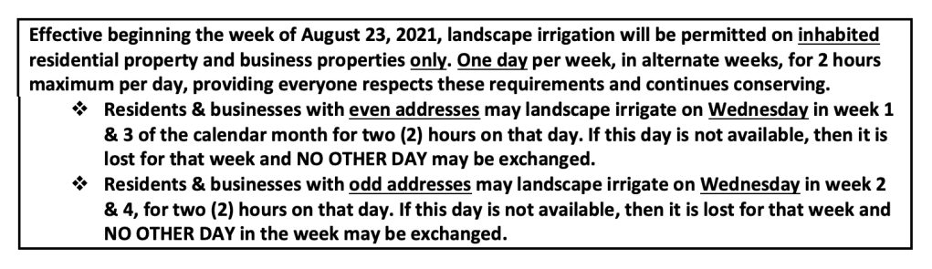 - Landscape watering is NOT allowed on Sundays in order to give our finished water tanks time to refill/replenish.